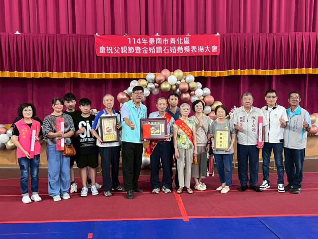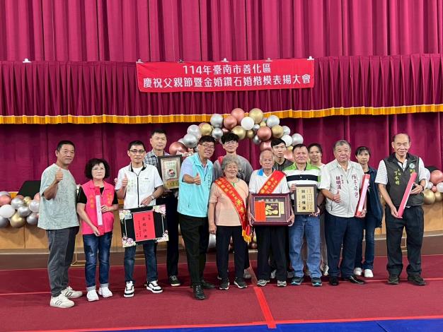 114年7月27日於善化多功能活動中心辦理表揚活動,由譚乃澄區長及各里里長見證下,慶賀各里模範父親及鑽石婚(金婚)賢伉儷。透過公開表揚儀式,將偉大的孝道精神及情牽一甲子的愛予以宣揚,同時喚起社會大眾對家庭、婚姻倫理之重視,希望讓眾人能從長輩身上學習到經營夫妻關係的哲學,並強化家庭倫理觀念。